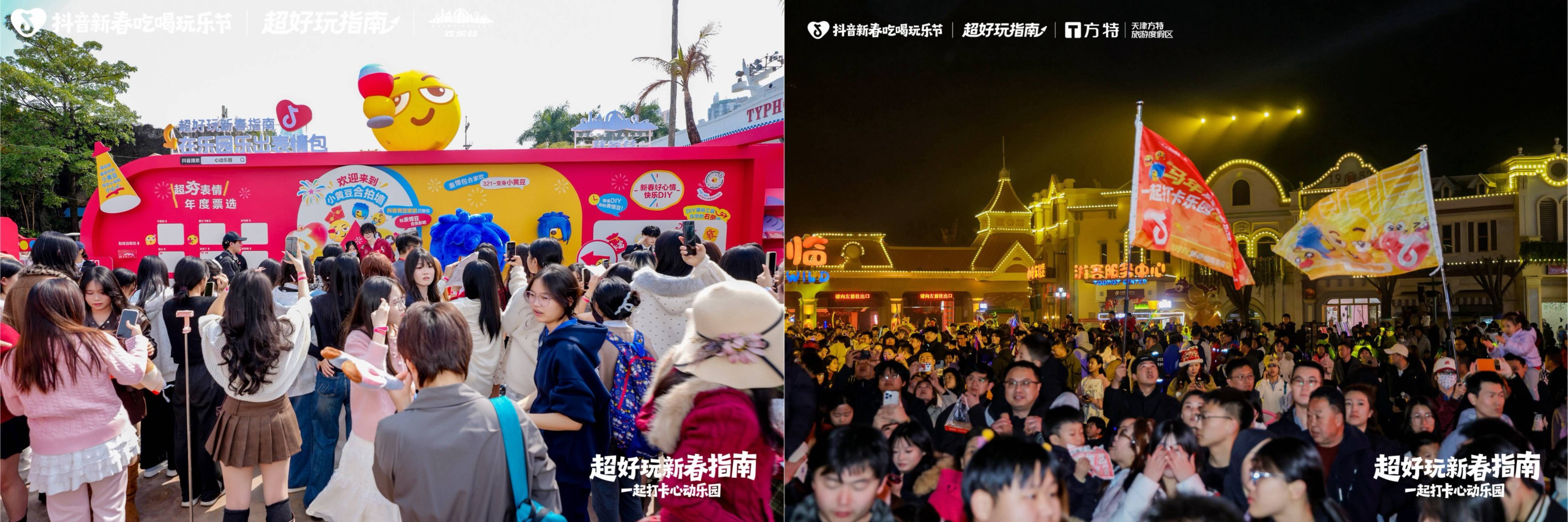 春节作为年度消费与出行的核心旺季,文旅消费持续升温,乐园场景凭借强沉浸、高互动的特质,成为亲子群体新春出游的首选。在此背景下,抖音生活服务启动【超好玩新春指南】项目活动,携手平台原生热度IP抖音黄豆表情,融合明星NPC互动、线下人气巡游、主题快闪等多元形式,打造覆盖线上线下的新春玩乐盛宴。此次活动不仅让乐园×IP的特色玩法成功破圈,更以IP联动为突破口,为合作乐园实现声量与交易的双重提升,也为行业提供了春节档乐园营销可复制的路径。